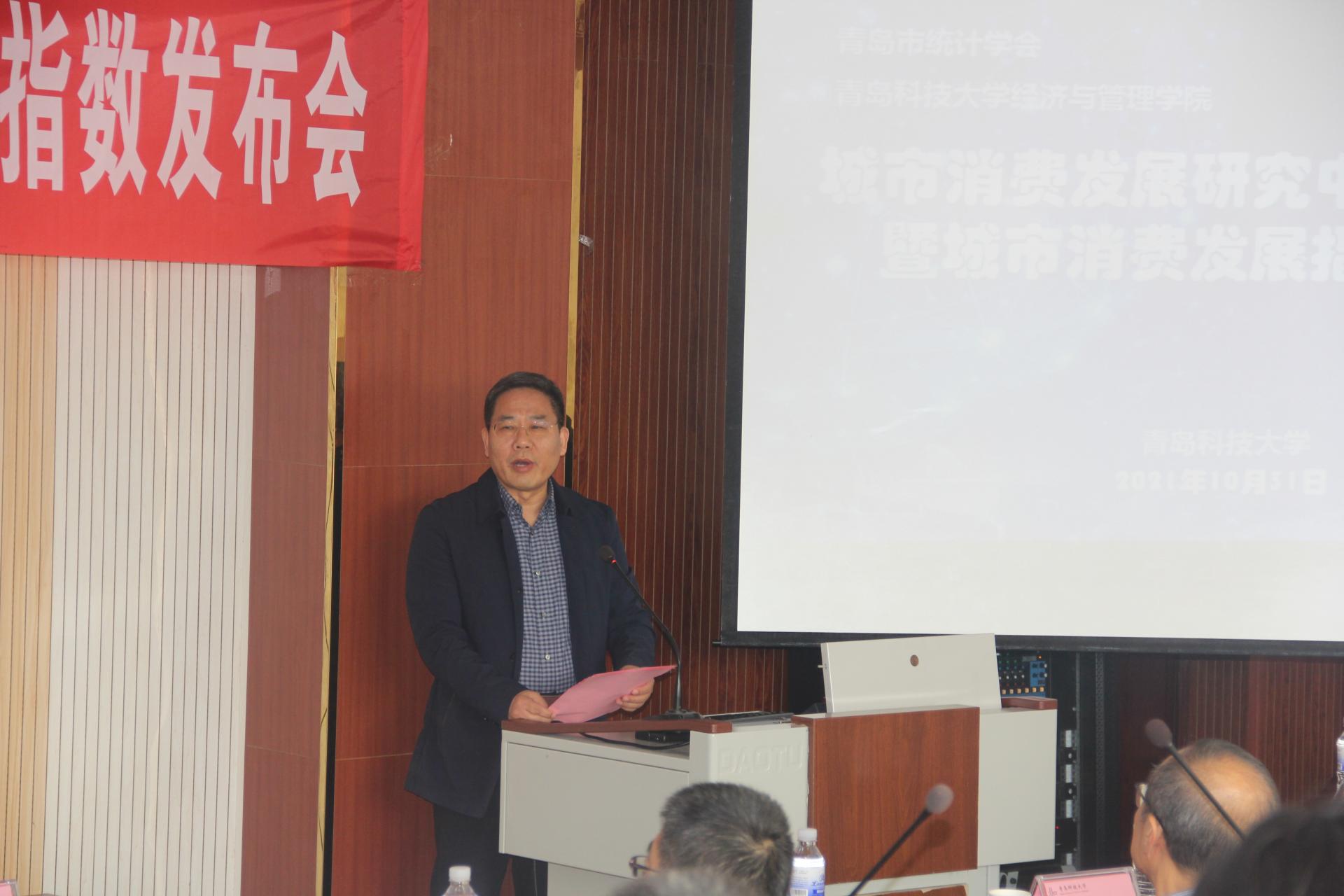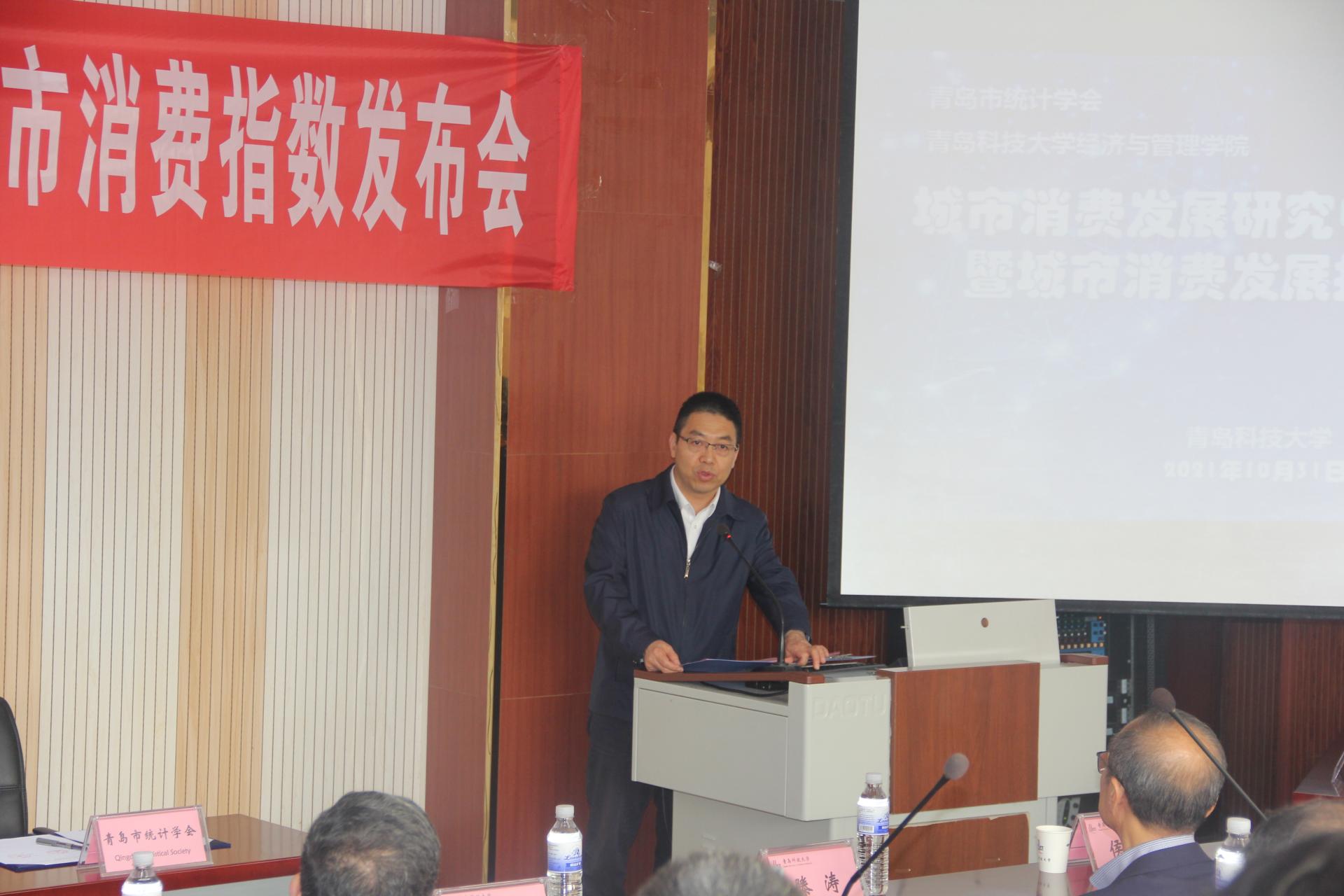 刘岐涛作致辞讲话,他指出,促进国民经济循环畅通,加快培育完整内需体系,是国家在双循环新发展格局下做出的重大战略举措。城市消费发展研究中心将以此为契机,开展消费领域深度研究,通过科学化、指数化对比分析,精准测度城市消费发展水平,打通消费堵点,明晰城市消费发展方向,为助力青岛打造国际消费中心城市做出积极贡献。