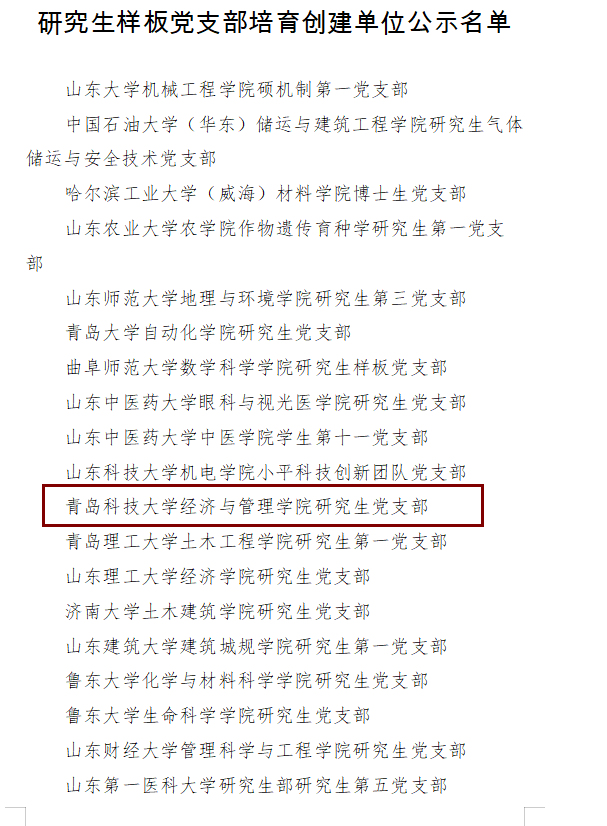 近日,根据《中共山东省委教育工委关于开展全省高校“研究生样板党支部”和“研究生党员标兵”创建工作的通知》(鲁教工委函〔2021〕1号)安排和评审工作方案,经组织推荐、专家评审、集体研究,共遴选产生了20个首批全省“研究生样板党支部”培育创建单位,我院研究生党支部成功入选,是学校首个入选的研究生党支部。