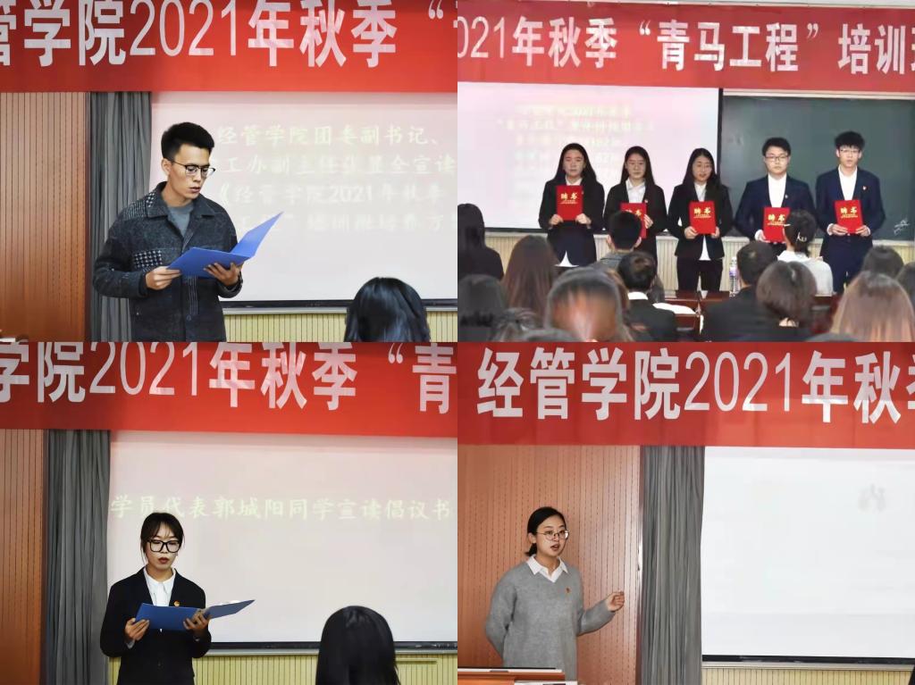 2021年秋季“青马工程”青年讲师团聘任名单》,校团委王丹为青年讲师团颁发聘任证书。学员代表郭城阳宣读倡议书,号召培训班全体学员围绕中心大局,争做先锋表率,并呼吁大家共同努力,在实现中华民族伟大复兴的中国梦的历史进程中贡献自己的青春力量。校团委王丹作“青马工程”培训班开班第一讲,围绕共青团性质、共青团组织体系、共青团基本职责、团的组织生活的基本制度以及智慧团建系统等方面,全面、系统地讲授共青团基础知识。