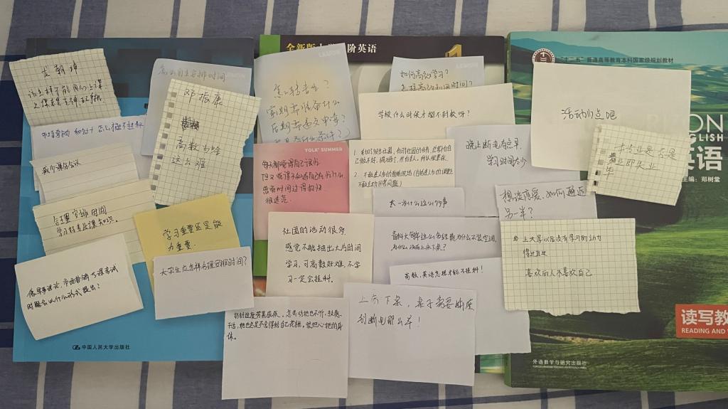 老师及辅导员挑选问题进行解答。师生间的情谊通过白纸黑字紧密地联系在了一起。