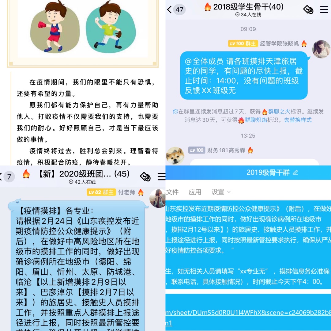 、年级、班级、宿舍”四级防控主体体系,织牢织密“网格化”疫情防控网。辅导员、班主任(导师)全方位联动,全面摸排、动态掌握寒假期间全体学生及共同生活的家庭成员健康状况和行程轨迹,确保每名学生返校前14天的旅居史、接触史、健康史底数清、情况明。及时根据学校通知做好重点地区疫情摸排工作并按照最新管控要求执行,确保从严从紧、科学精准落实好疫情防控各项要求。积极引导全体学生在“青科学工”平台进行累计连续14天健康打卡,如实、主动向辅导员报告健康状况和活动轨迹。通过线上主题班会、发布线上提醒、无码欧美