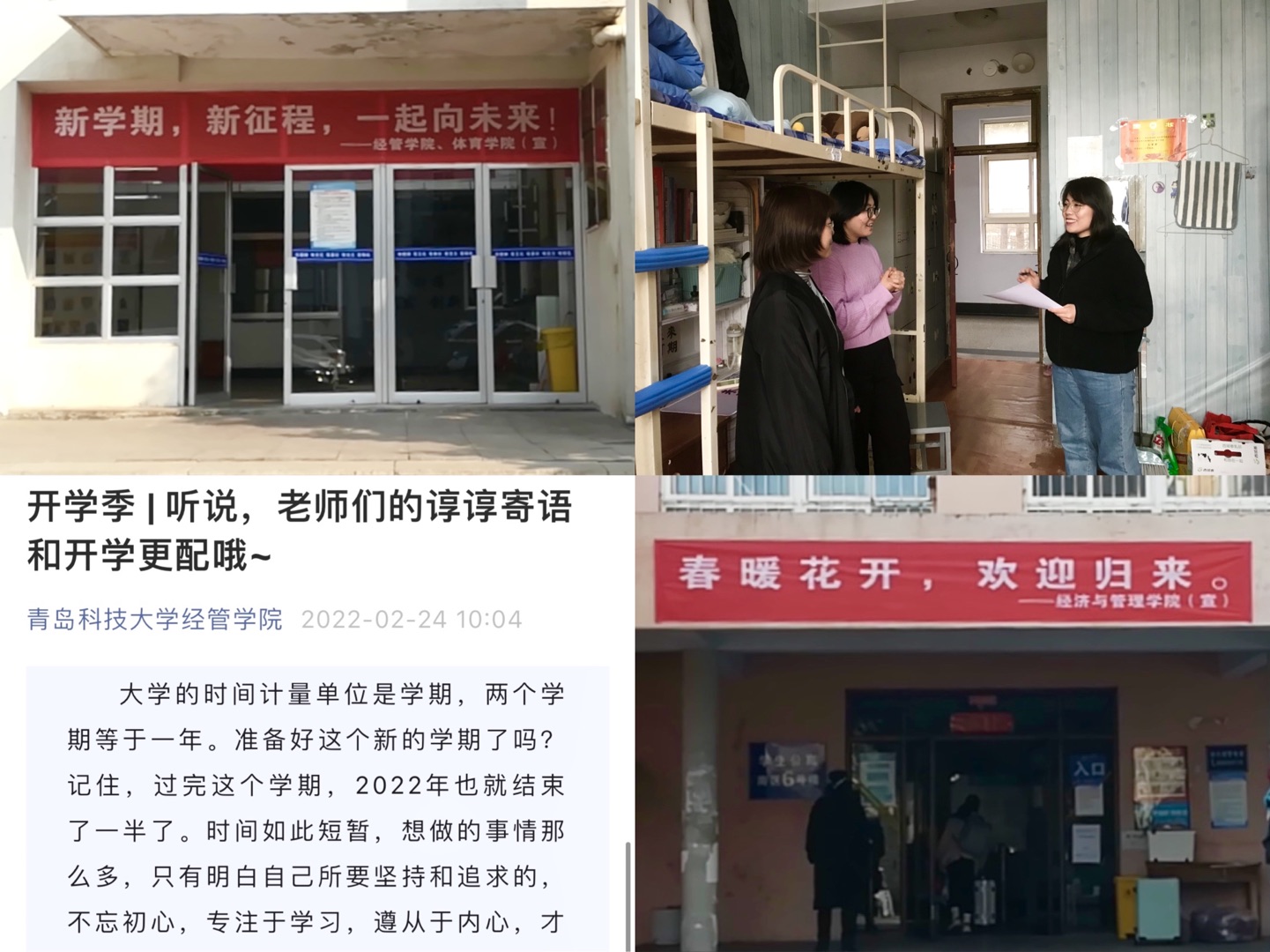 依托“四个到位”,暖心护航让开学季有情怀有温度:“心理动态关注到位”,学工队伍第一时间开展“一对一”返校服务工作,针对夜间返校学生、因疫情暂缓返校学生、学业困难、家庭困难等不同类型学生开展深入交流,积极做好心理关注与疏导,确保学生安全稳定;“场景育人氛围到位”,充分发挥校园场景的文化育人效能,在经管楼、宿舍楼门口、宿舍楼道等区域悬挂横幅并张贴开学标签,送上新学期的祝福,带给学生满满的归属感;“指导帮扶跟进到位”,组织教师为学生送上开学“锦囊妙计”与新学期暖心寄语,引导全体学子迎战新学期、积极向未来;“服务关怀暖心到位”,院领导、全体辅导员深入学生宿舍,了解返校学生的生活学习现状,持续做好学生返校后的人文关怀与呵护。正如2021级学生于辰洋所说,“返校旅途虽然辛苦,但是进入校园后看到热情迎接我们的老师、精心布置的校园场景与及时组织的核酸检测,让我们内心感到无比的踏实、温暖与感恩”。