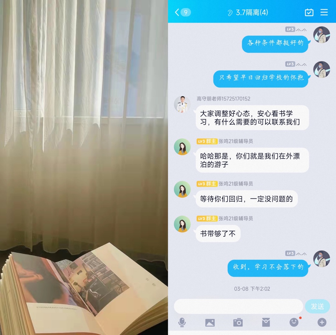 3月7日,按照学校既定要求,全体同学正在安心等待全员核酸检测的进一步通知。在焦急地等待中,辅导员老师的一通电话让我忐忑不安起来,由于某种原因,我可能需要采取一些“特殊”的措施。听到这个消息,内心不慌乱,是假的。脑海中的信息不断涌现,回想着自己的行程轨迹,想象着该如何和家人报平安,该如何让舍友安心,一切的安然瞬间被打破。“嘉楠,不要急,不要有心理负担和压力。”老师的几番话将我从游离中拉了回来,“你先收拾下被褥,高老师一会开车去接你。”“对了,不要忘记带书本和电脑”。