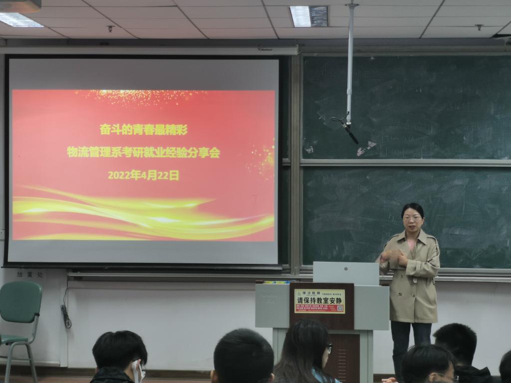 物流管理专业于明德楼212教室举办 “奋斗的青春最精彩——2022届考研就业经验分享会”,党委领导班子联系支部成员王成果书记参与会议。本次分享会邀请了2018级5位优秀同学就考研、就业、竞赛相关方面进行经验分享。分享会由物流系副主任王艳婷老师主持,物流专业19级、20级、21级同学参加活动。
