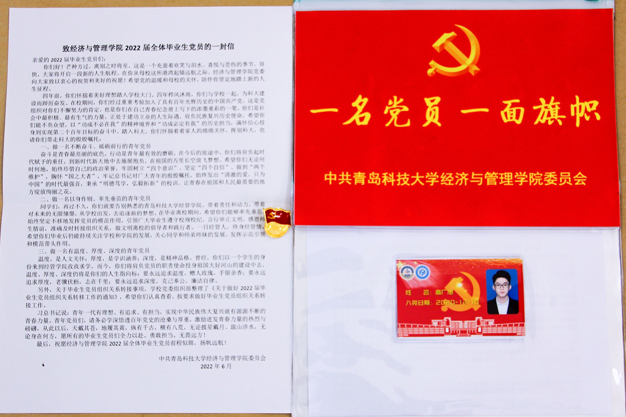 党委致2022届毕业生党员的一封信》,党员身份证和一枚党徽,希望广大毕业生党员不忘入党初心,牢记一名党员就是一面旗帜,做理想信念坚定的马克思主义者、做追梦圆梦路上的奋斗者。