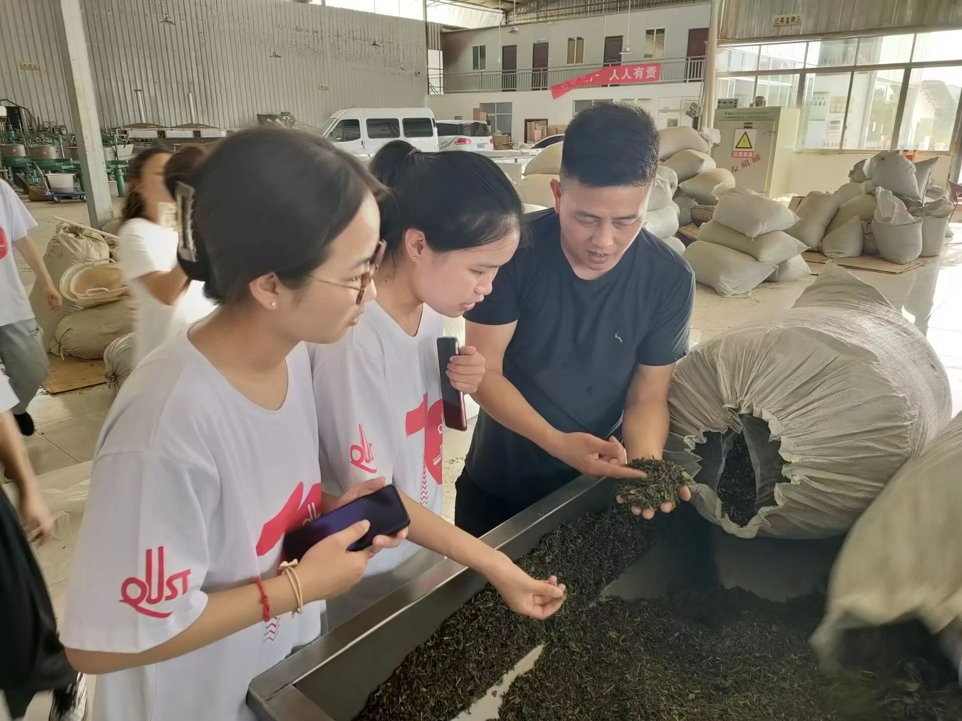 7月16日上午,观察团抵达茶厂,茶厂负责人余龙君以及谢光庆在对团队成员表示热烈欢迎的同时为实践团队的参观学习提供了帮助与支持。为了让观察团成员们更好地了解茶叶的制作工序以及流程,茶厂负责人带领团队成员参观了制茶工厂完备的制茶流水设备,介绍了制茶过程中各个工艺的基本原理以及制茶过程中的注意事项。通过负责人的讲解与描述,团队成员了解了茶叶从采摘到制作完成的采青、萎凋、发酵、杀青、揉捻、脱水、筛选等一系列流程,对于茶加工的过程也有了更深的体会。