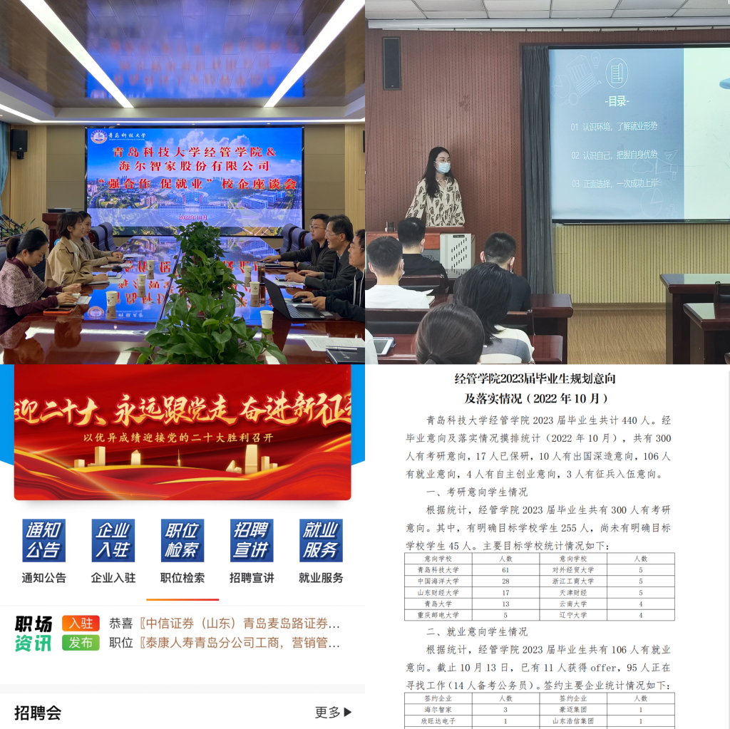 顺应网络发展新形势,不断强化就业工作信息化建设,自主开发“经管就业”小程序,设置就业信息通知、招聘信息发布、职位智能检索、预约招聘宣讲、就业政策帮扶五大模块,为用人单位和毕业生搭建高效的“双向选择”平台,实现就业信息的“一键直达”。自上线以来,小程序累计入驻企业22家,发布200余条经管类岗位需求信息,浏览量达10000+人次,持续扩大就业辐射面。坚持国家导向、学校培养、学生需求相结合,整合校外企业和优秀校友资源,积极拓展就业市场,与海尔智家、中信证券等知名企业加强校企深度合作、供需精准对接,通过开展“强合作 促就业”校企座谈会、访企拓岗等系列活动,实现学校人才培养与企业人才需求之间的“无缝对接”,为毕业生高质量就业提供强有力保障。
