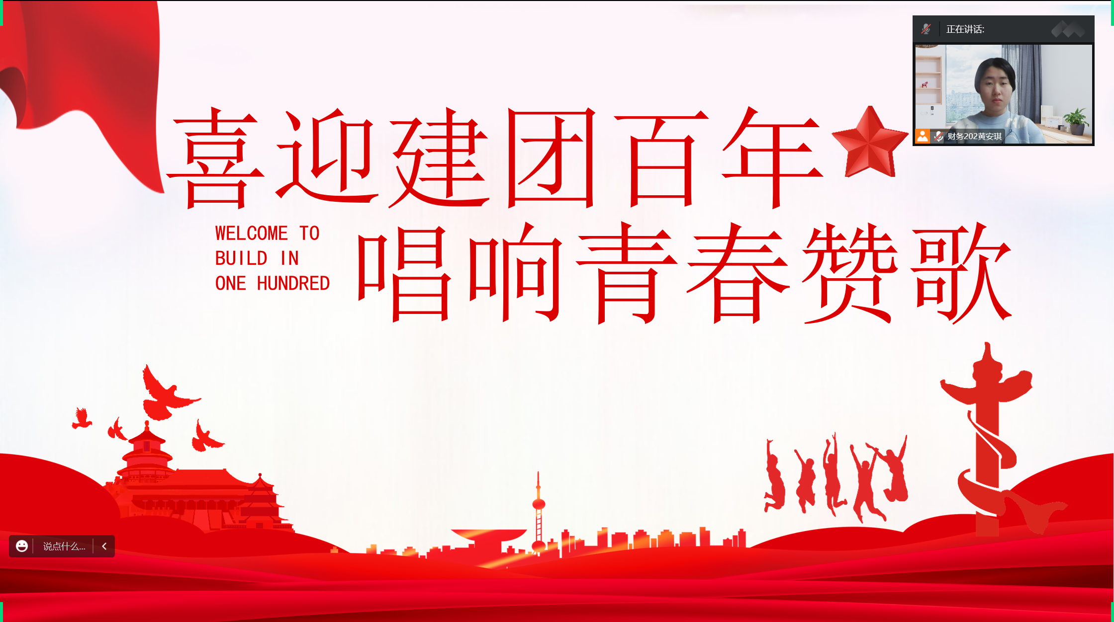 学生会组织开展建团百年系列主题云团课,云团课由学生会成员黄安琪主持,学生会成员集体参与。中国共青团在100年来经受住了严峻的考验,广大共青团员坚定不移地投身于革命的洪流中。共青团走过的一百年,是千磨万击还坚劲、任尔东西南北风的一百年,是雄关漫道真如铁、而今迈步从头越的一百年。