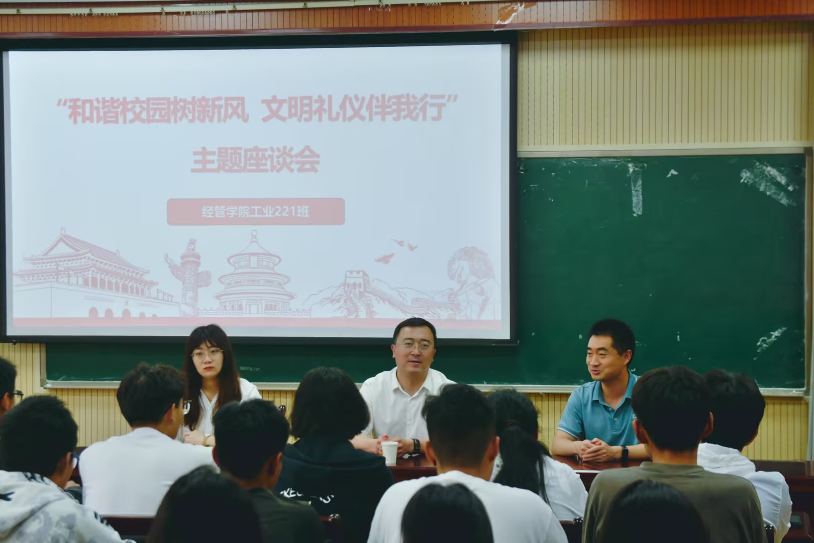 工业221在经管楼419会议室组织开展“和谐校园树新风 文明礼仪伴我行”主题座谈会。联系干部党委(校长)办公室副主任匡荣富来到同学们身边,倾听大家对文明礼仪的思考理解,与同学们畅谈学习生活中的问题困惑和所思所悟。无码欧美