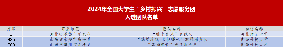 “基层连线 共携曙光”志愿服务队(队长:孙雨辰)“幸福‘棉’长”志愿服务队(队长:王由甲)从748所高校的1000支大学生志愿服务团队中脱颖而出,成功入选。