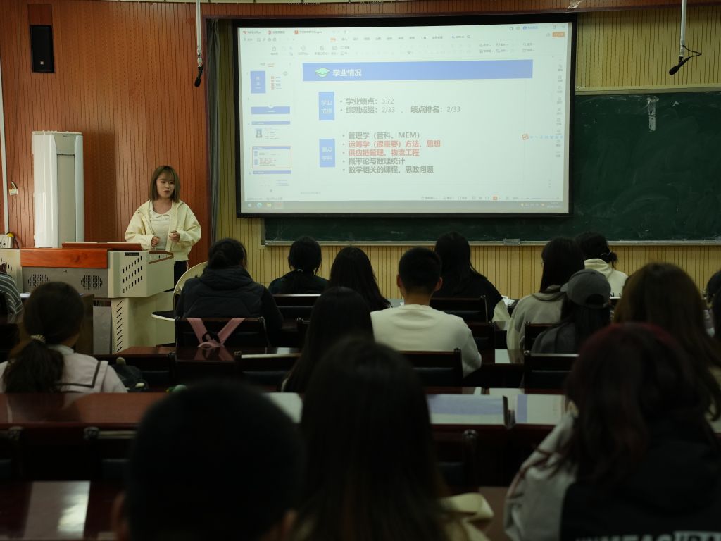 工业专业的李子超以自己对工业工程的深刻理解,为同学们打开了专业知识的新视野,强调特别是要提前了解保研政策、明确保研目标院校及专业、制定科学合理的复习计划,鼓励同学们勇敢追梦。物流专业的于婉婷详细地为同学们解读了本专业的发展方向,解答了对于有目标保研的同学需要做的准备工作。国贸专业的顾茗月分享了保研前期规划、预推免面试心得以及竞赛宝贵经验,为同学们说明了申请的注意事项,讲明夏令营和预推免的区别,解决了学生们的相关困惑。