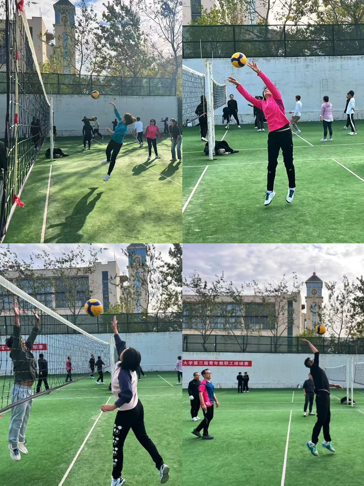 比赛在紧张而友好的氛围中进行。赛场上,李老师与老师们身姿矫健,配合默契,展现出了高超的球技和团队协作精神。他们的每一次扣杀、拦网和救球都赢得了在场观众的阵阵掌声和欢呼声。赛场上,各参赛队伍热情高涨,斗志昂扬,展现了积极向上的精神风貌。比赛分为女子青年队,女子中年队,男子队,学生队,男女混合队等多个小组,既有男女排老师之间的对决,也有师生混合队伍的趣味比拼,使得整个赛场气氛热烈而和谐。比赛中双方队员相互鼓励,彼此尊重,充分体现了友谊第一、比赛第二的体育精神。