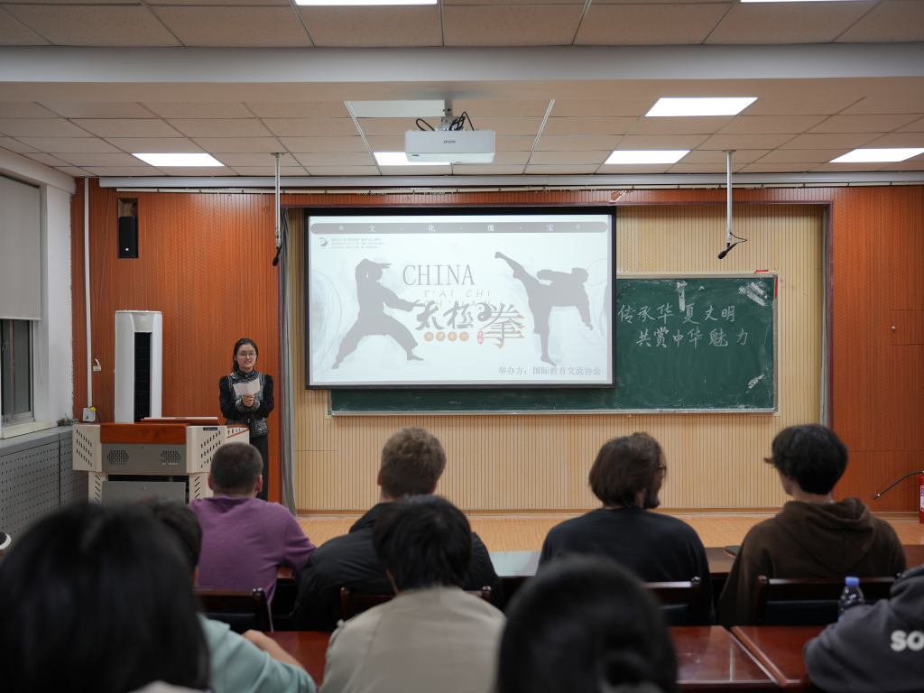 首先,罗雁月同学向外国留学生们介绍太极拳的历史渊源和文化内涵。接着,弈剑阁成员示范太极拳的基本动作,现场教学太极动作。成员们把太极拳刚柔并济的特点展现得淋漓尽致,为外国留学生们呈现一场蕴含深厚中国文化底蕴的视觉盛宴,赢得热烈掌声。