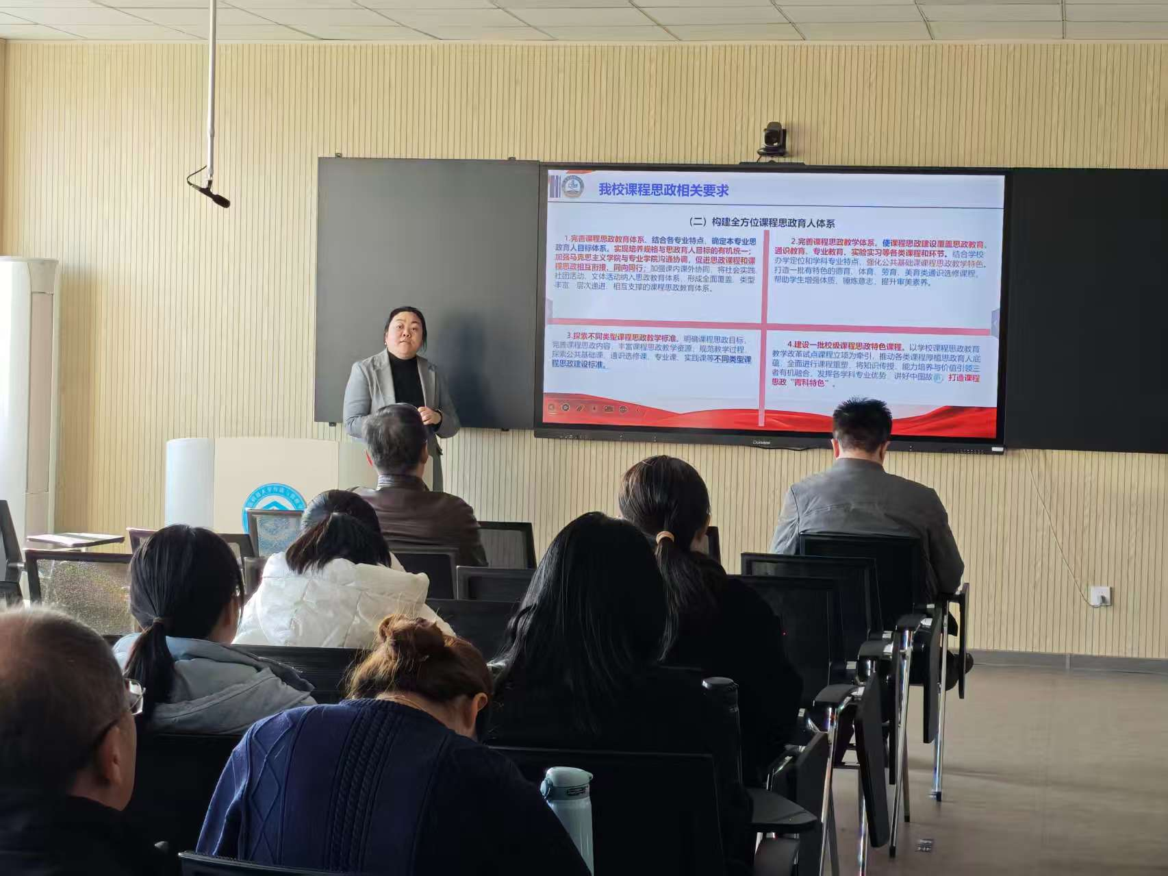 培训会上,张玉老师围绕课程思政相关制度文件解读、我校课程思政建设具体要求和人工智能赋能课程思政的创新路径三个维度展开系统阐述。培训以国家政策文件为根本遵循,系统解读了课程思政建设的制度框架与实践要求。她带领全体教师重温了《高等学校课程思政建设指导纲要》等纲领性文件,结合教育部最新发布的《人工智能助推教师队伍建设行动试点工作的通知》,强调要准确把握“价值塑造、知识传授、能力培养”三位一体的育人要求,明确课程思政建设的核心在于将社会主义核心价值观融入专业教育全过程。并对标《青岛科技大学课程思政实施方案》,详细解读了学校课程思政建设提出的具体要求,以及文件所提出的七大任务和十九项具体要求。
