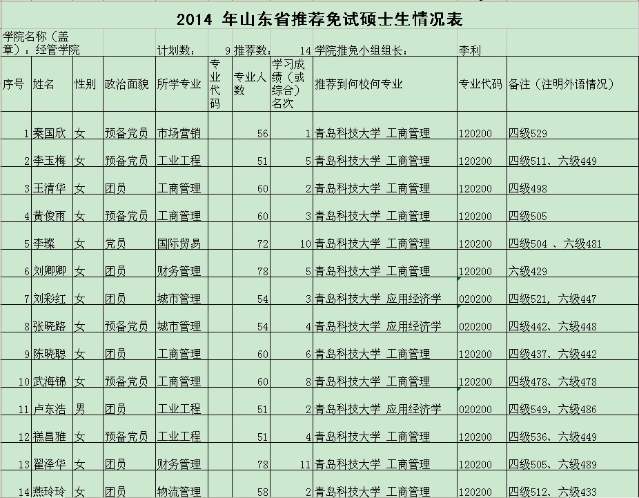 青岛科技大学经管无码欧美 2014年拟推荐免试硕士研究生公示材料