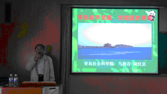 此次报告分为五大部分:“蓝色跨越是青岛市实现率先科学发展的必由之路”,“青岛市发展轨迹与海洋的交集”,“青岛蓝色经济的过去、现在和未来”,“青岛蓝色文化的过去、现在和未来”,“勇于担当蓝色跨越的领军城市——海洋经济文化国家队”。报告从各个方面系统地阐述了青岛的发展与海洋的密不可分的联系,“临海而生,因海而荣”的思想贯穿于整场报告会。马庚存研究员提出21世纪是海洋的世纪,各国、国内各地区竞相发展海洋事业,向海洋进军。青岛作为山东半岛蓝色经济区核心区域的龙头城市,再次历史性地承担起了国家使命,迎来了难得的重大机遇。马庚存研究员在整场学术报告中多次指出,青岛拥有其他城市所不可比拟的优质海洋资源,无论是在海洋军事、海洋经济还是海洋文化,青岛在近几年来都取得了历史性的突破。并且马庚存研究员还将青岛市的各个历史发展阶段一一列举,从历史的角度展示了青岛的城市发展与蓝色海洋的紧密联系,“蓝色青岛”的发展规划符合历史的要求、发展的要求和人民的要求。
