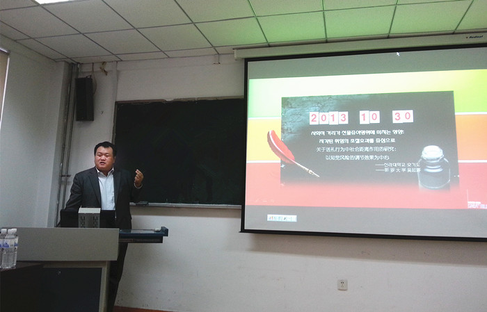 本次大会共有25位专家展现了他们最新的研究成果。文宰鹤教授作了“有关中国广告信息类型的研究”的报告,黄昌润教授作了“驻青岛韩国人对青岛市观光对象的满足度”的报告,郑载乙教授作了“自身利益和伦理意识对税务公务员进行决策时的影响”的报告。我院教师杨友才和李冬新分别作了“制度变迁、路径依赖与经济增长的模型与实证分析”、“Research on Regional Differences of Entrepreneurship Features and Regional Private Economic Growth”的报告。会场座无虚席,与会代表踊跃提问,就经济经营领域的诸多问题及研究方法进行了深入交流。