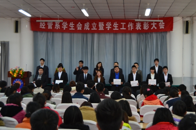 大会在与会的全体老师和同学唱国歌中拉开帷幕。李淑贞宣读了《关于成立高密校区经管系学生会的通知》,张同雷宣读了经管系学生会副部以上成员名单,与会老师为他们颁发了聘书。首届系学生会主席周凡发表了就职演讲,对学生会未来做了工作设想和展望。李春家要求学生会同学要发挥好学生干部的作用,做好老师的助手,起好桥梁和纽带作用,同时强调要加强学习。张同雷首先对经管系学生会成立表示祝贺,对学生会提出了严格的要求和标准,并对学生会今后工作的开展提出了很好的建议。