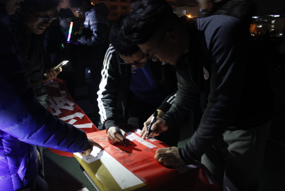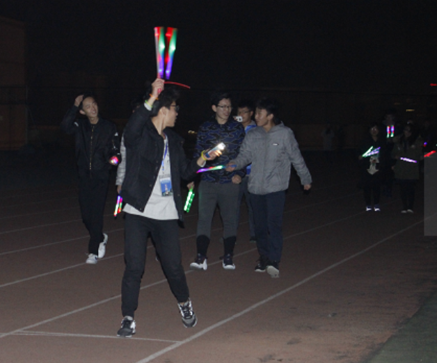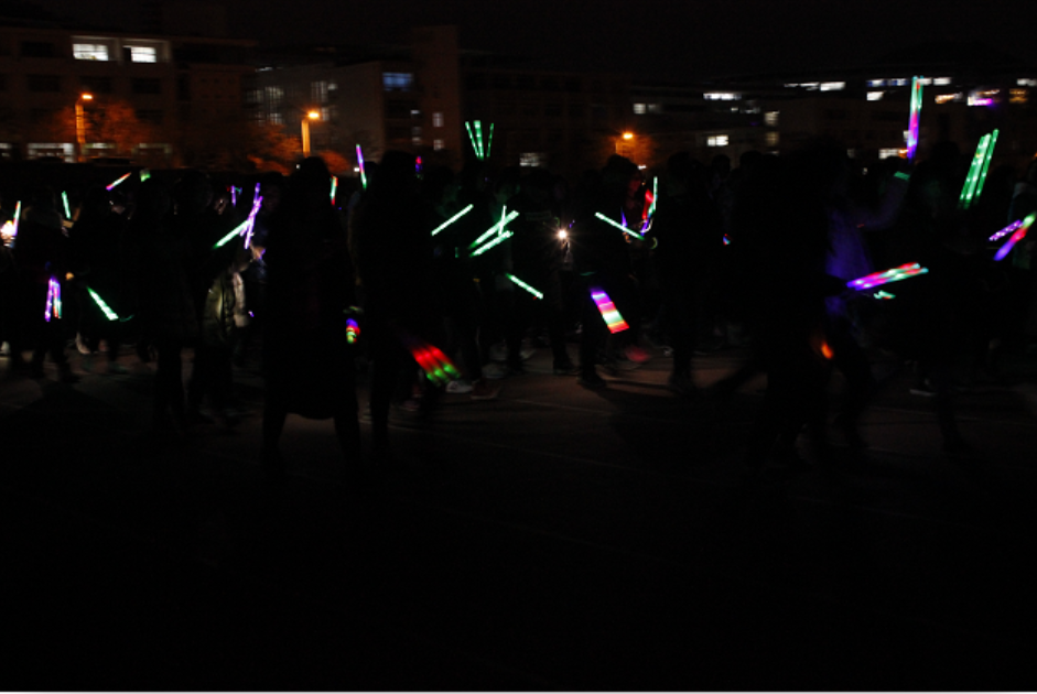 青岛冬日的寒风丝毫没有减弱同学们的热情,晚上七点整,学生们便已在操场集结完毕,主席台前荧光点点,闪烁不断。在领跑人员的带领下,队列绵延百米,形成一条闪光的长龙,追逐奔腾在南苑操场上。同学们结伴而行,紧紧相随,手中舞动的荧光棒照亮了冬日的夜空。当代大学生的团结与热情,友爱与拼搏展现于操场之上。活动结束后,同学们在横幅上纷纷签字,并在主席台前合影留念。