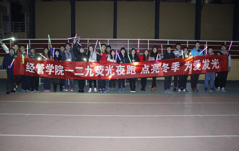 在南苑操场举行荧光夜跑活动。此次活动吸引了三百余名经管学子参加,现场反响热烈,同学们情绪高涨。
