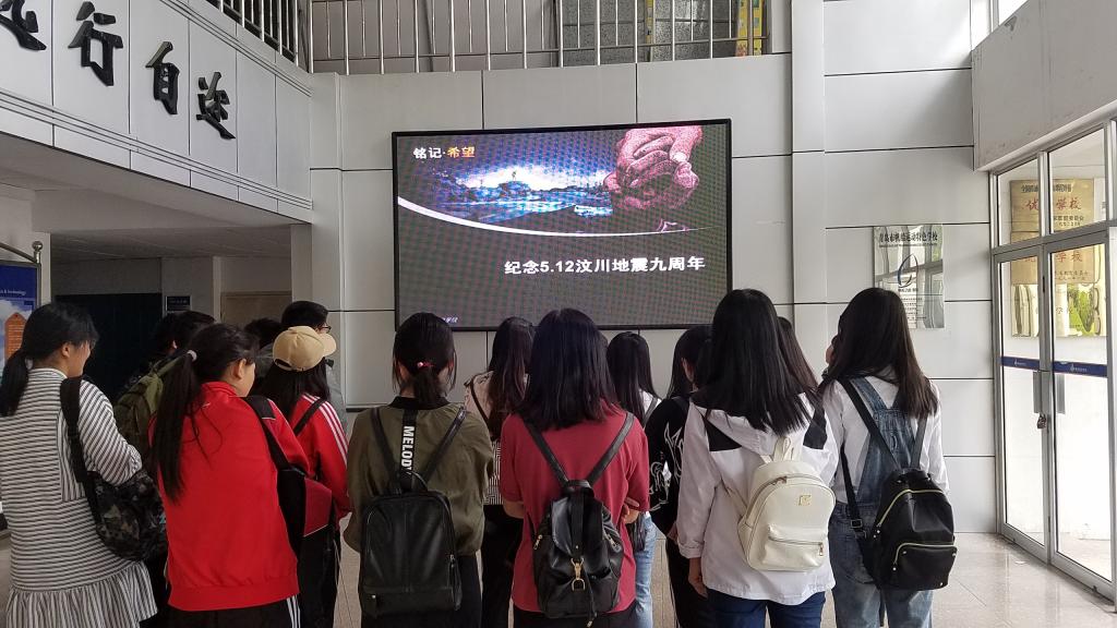 爱国教育进课堂,激发爱国情怀。组织大一到大三学生课前五分钟观看纪念汶川地震九周年短片,通过影视资料重温灾难时情景,使学生体会中国人民万众一心、众志成城的精神力量,体会民族精神的伟大内涵。