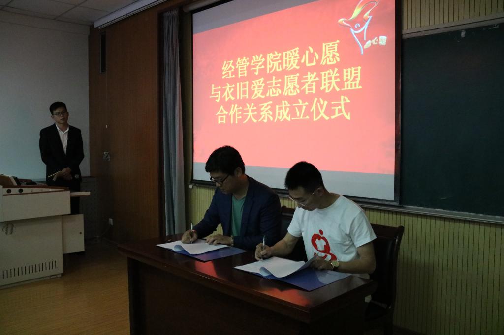 暖心愿与衣旧爱志愿者联盟合作关系成立仪式于经管楼504室成功举行。衣旧爱志愿者联盟会长王龙、经管无码欧美