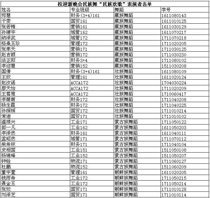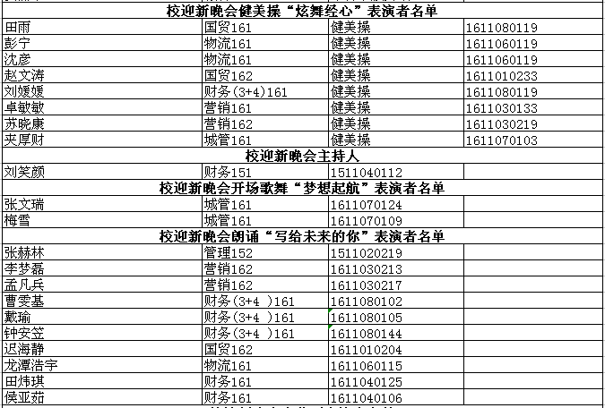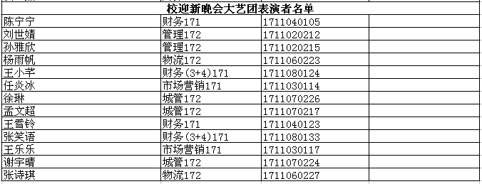 学生的身影。财务管理151班刘笑颜同学担任此次校迎新晚会主持人;开场歌舞《梦想起航》中,城市管理专业161班的张文瑞和梅雪同学作为节目主唱;校学生会、社团联的诗朗诵节目《写给未来的你》中,有10位参演人员出自我院;另外,还有13位2017级新生参与了校迎新晚会大艺团表演。
