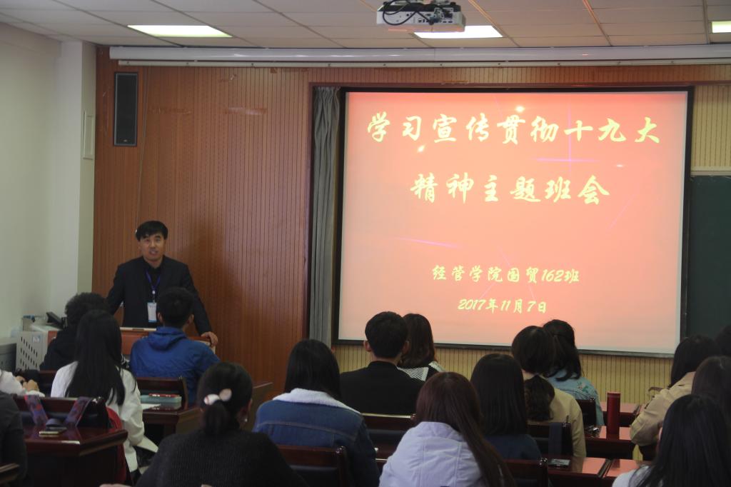党总支书记聂法良走进联系班级国贸162班,参加“学习宣传贯彻十九大精神”主题班会。与同学们共话当代大学生如何以实际行动学习宣传贯彻十九大精神,畅谈新时代大学生的理想目标。