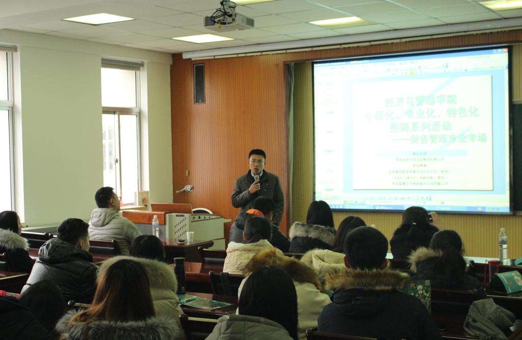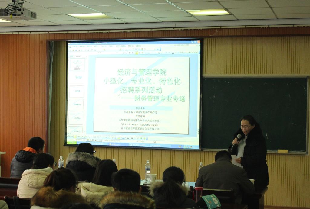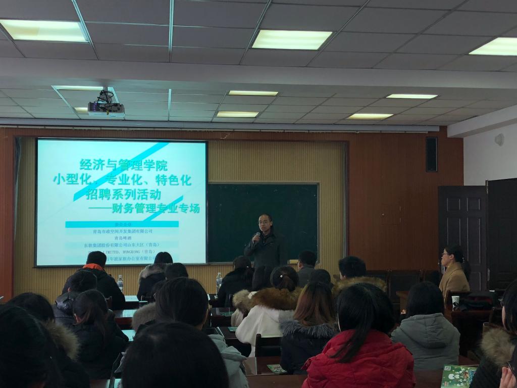 小型化、专业化、特色化招聘系列活动——财务管理专业专场在经管楼419室成功举办,青岛啤酒山东大区财务总监王国清\青岛市政空间开发集团有限公司子公司财务总监李翠艳、东软集团股份有限公司山东大区财务总监高雪松、JSPACE LIMITED HONGKONG(青岛)财务总监薛红梅、青岛百年渡家族办公室有限公司行政经理孟丽君代表企业前来招聘。经管无码欧美
