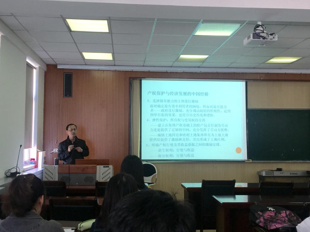 讲座开始前,首先由杨友才教授就魏建的个人简历向全体师生做了简要介绍,魏建教授是法经济学领域的领军人物,教育部新世纪人才,在《中国社会科学》、《经济研究》、《管理世界》等高水平一流杂志发表文章四十余篇。接着,魏建教授做了题为《中国长期经济增长的产权基础》的专题报告,报告围绕中国近40年经济增长的基本事实、中国产权改革与保护促进经济增长的历程、产权保护和改革的中国经验、理论分析和国际比较四方面展开讲解。他提出的“产权问题始终是核心问题,产权改革始终是改革的关键”、“公有制是我国的特殊所在”等观点引起大家的强烈共鸣。讲座引起大家热烈讨论和踊跃提问,魏建教授对师生提出的问题进行了详细解答,使同学们受益匪浅。