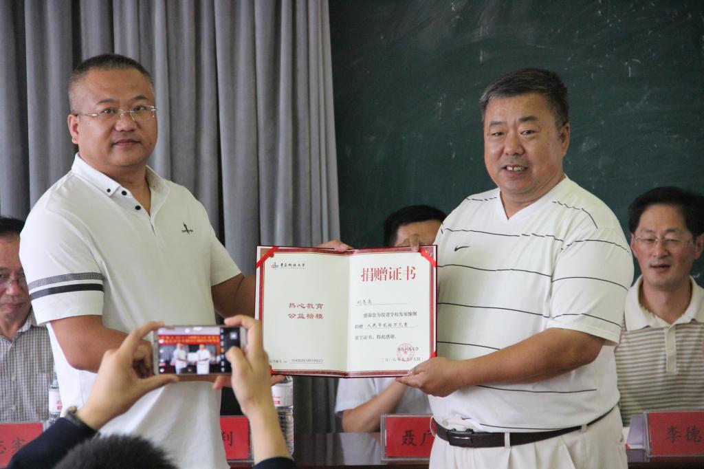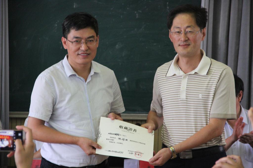 2011级MBA校友刘亮亮捐赠基金,张元利为他颁发捐赠证书。