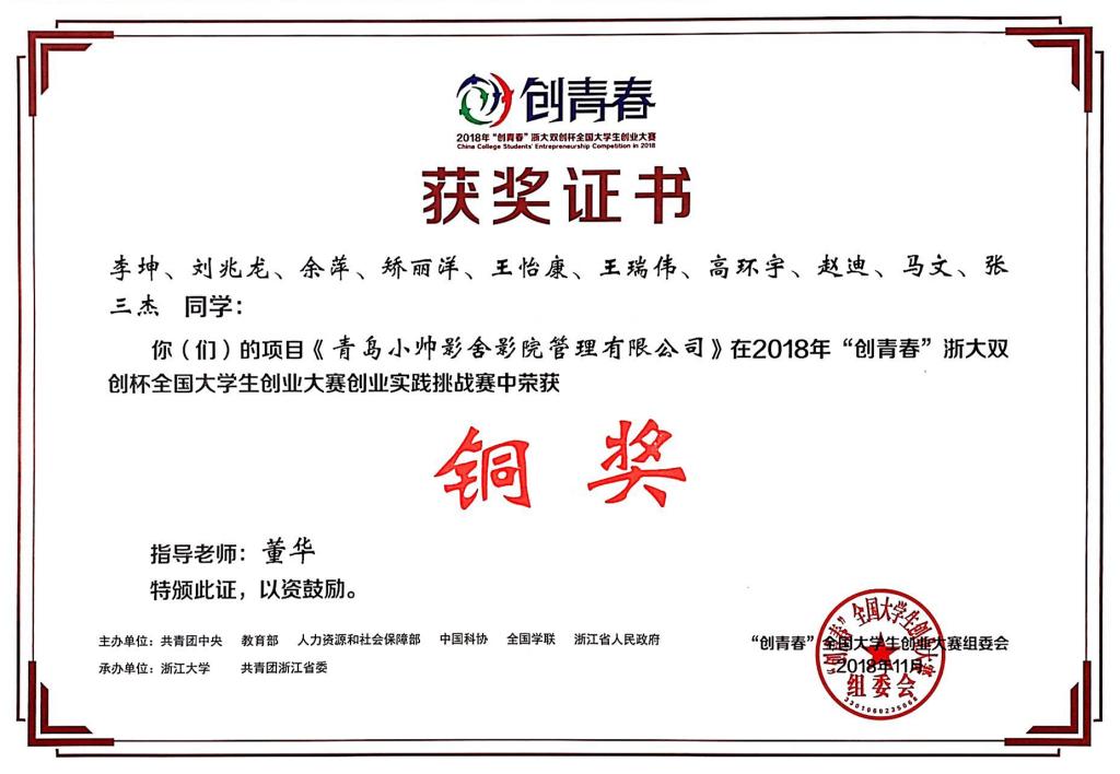 青岛小帅影舍影院管理有限公司成立于2017年,是由海尔小帅和9号楼团队联合打造、具有全新模式的校园院线品牌,现阶段公司主要经营小帅大圣影舍加盟品牌,属于影视娱乐中私人点播影院的范畴。自2016年10月项目的落地至今已有连锁店11家,青岛高校市场已实现全覆盖。参赛学生李坤、刘兆龙、余萍、矫丽洋、王怡康、王瑞伟、高环宇、赵迪、马文、张三杰在指导老师董华的带领下,历经校赛、省赛、国赛的层层打磨,最终获得国赛铜奖的成绩,展现了经管学子昂扬向上的精神风貌和积极进取的奋斗精神。
