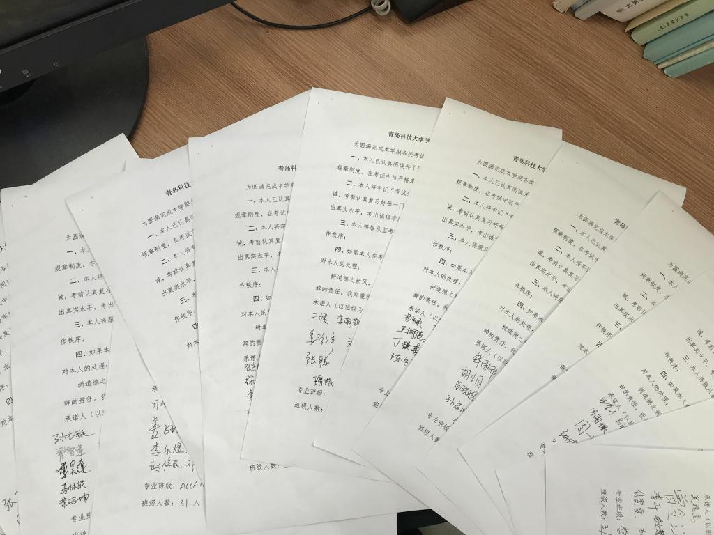召开主题班会,严守纪律红线。各年级辅导员、班主任召开诚信考试主题班会,带领学生集中学习并解读了《青岛科技大学学生纪律处分管理规定》,分年级组织全体学生签订诚信考试承诺书,结合典型案例,引导学生严守考试纪律红线。