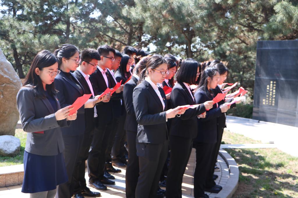 学生党支部开展“红色朗读--一党员一段文”红色朗读主题党日活动。苍翠的松柏下,肃穆的音乐中,财务(3+4)171班许心如、国贸162班欧阳文璐、物流161班程亚男、亓长智、薛明远依次带来朗诵《盛世中国》和《我是青年》,全体党员集体朗诵了《祖国啊,我亲爱的祖国》,红色书声,声声入耳,一场朗读,读出了新时代青年学子的雄心壮志和信心满满。随后,全体党员在鲜红的党旗下重温入党誓词,洪亮铿锵的声音,豪迈有力的誓言饱含了大家致敬先烈,传承英雄精神的坚定决心。党员们纷纷表示,将汲取红色力量,把对革命先烈的怀念和敬仰之情,转化为立足本职、敢为人先的力量,将个人发展与国家命运相结合,真正做到“内化于心,外化于行”。