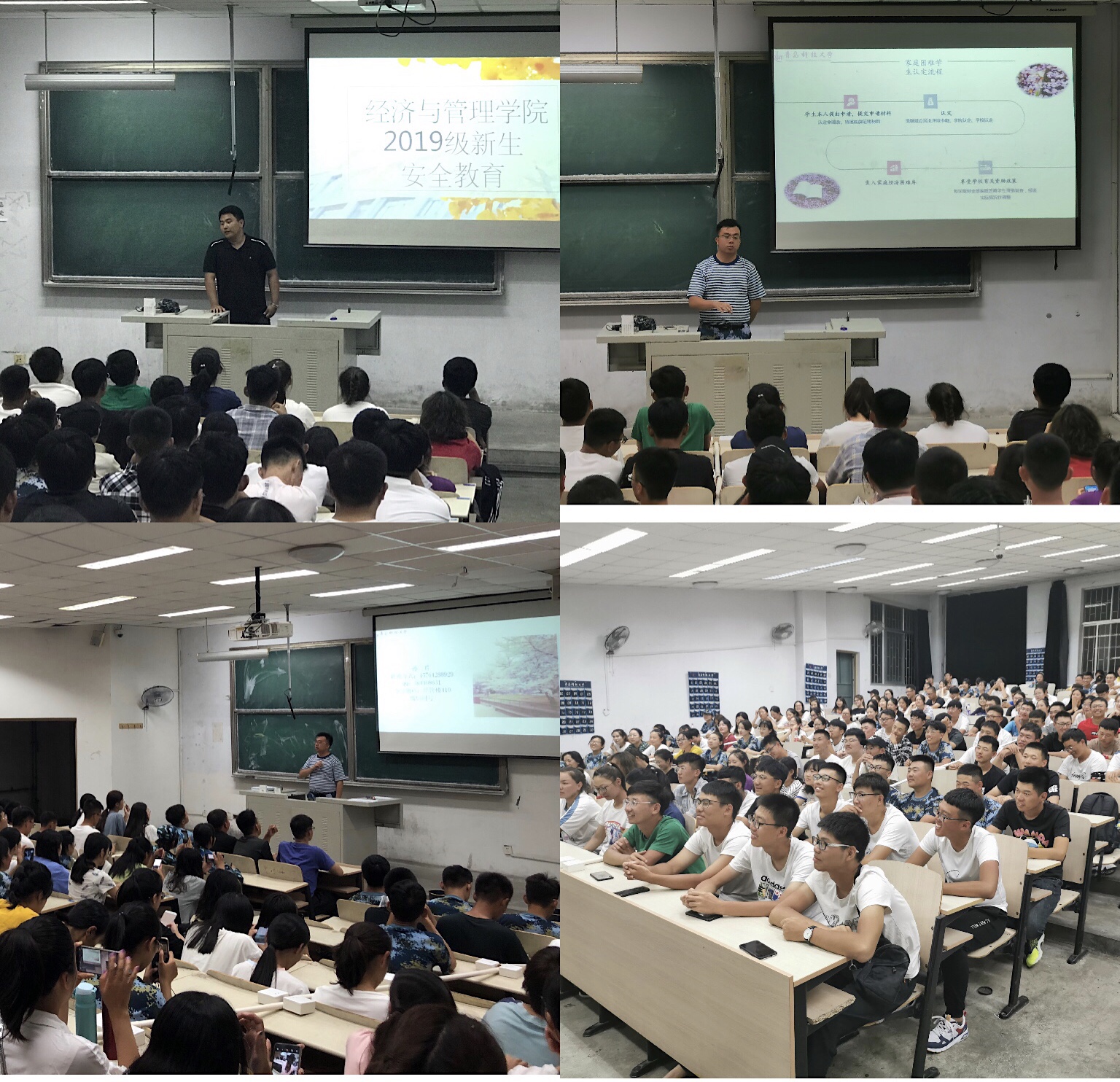于弘毅楼E102、E104举行2019级新生适应性教育大会,2019级辅导员孙一君、初桂民、于潇华参加此次大会。