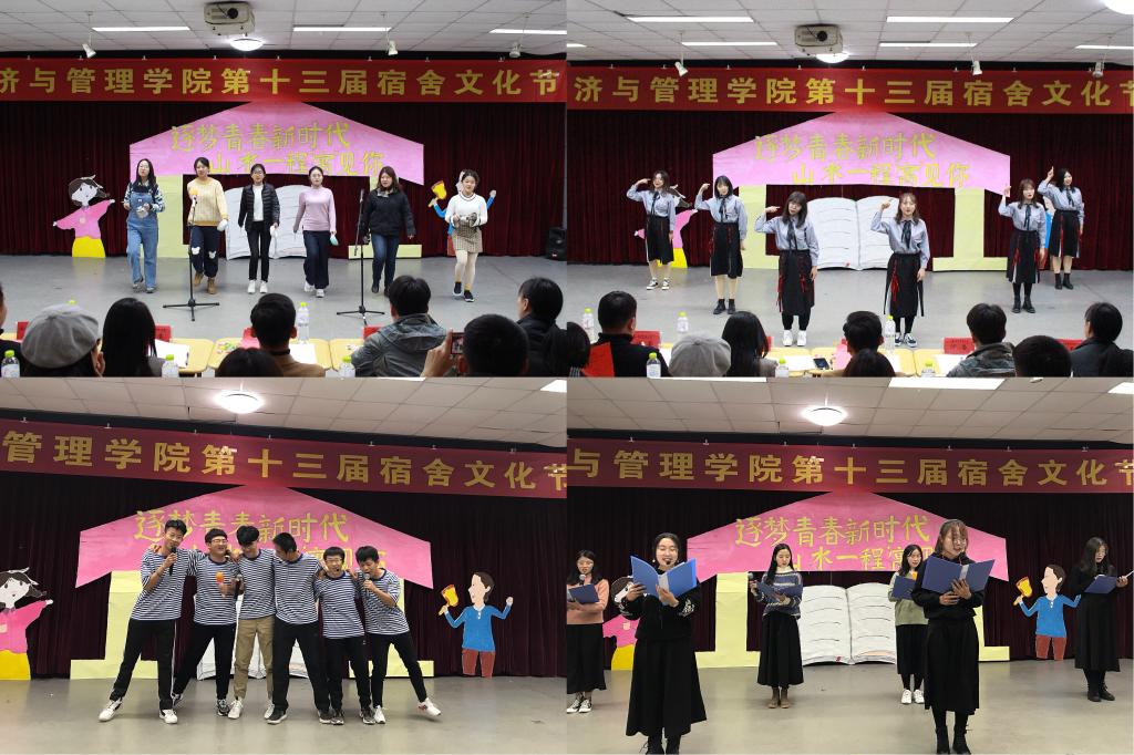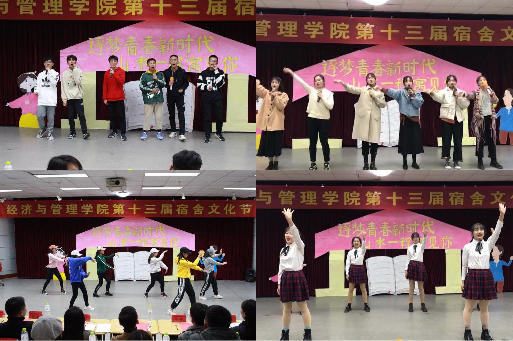 本次文化节采用表演战队PK的形式进行,经过前期的层层选拔,共有八个宿舍的节目最终被选上舞台,分别归为“青春队”和“逐梦队”。大赛首先在舞蹈《Instruction》中正式拉开了帷幕。一段段精心制作的宿舍视频展示了每一个宿舍的温馨和谐,一个个悉心准备的比赛节目介绍了每一个“小家”的特色文化。比赛环节,各宿舍节目推陈出新,别具一格,融合歌曲、舞蹈、小品、朗诵、手语操等元素,展现了当代经管学子积极向上的优秀精神面貌,为现场观众呈现了一场美妙的视听盛宴。