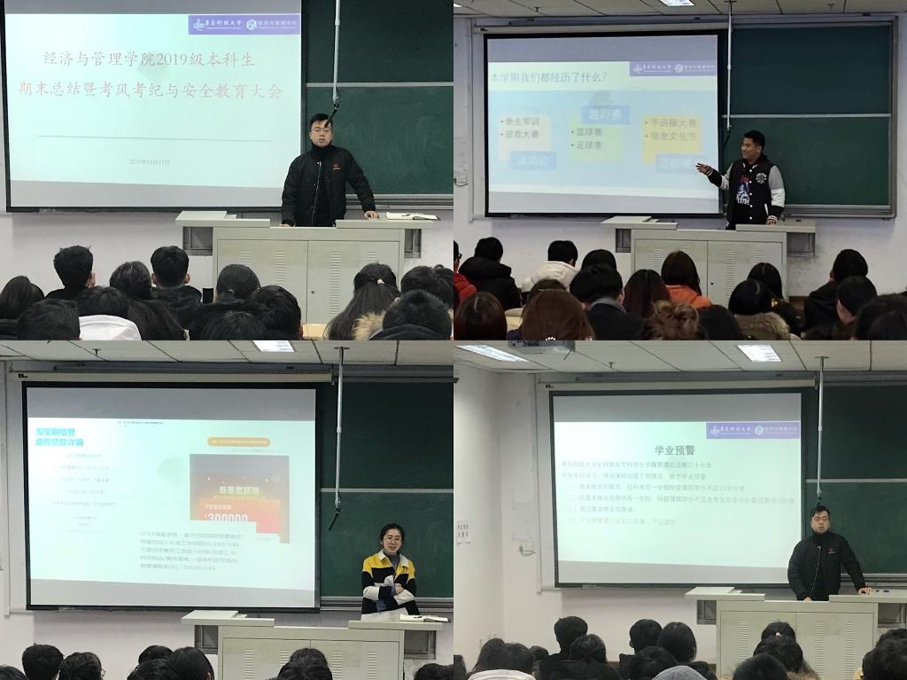 于明德楼412、424分专业召开2019级本科生期末总结暨考风考纪与安全教育大会。本次大会由19级辅导员孙一君老师、初桂民老师、于潇华老师主持,19级全体学生参加。