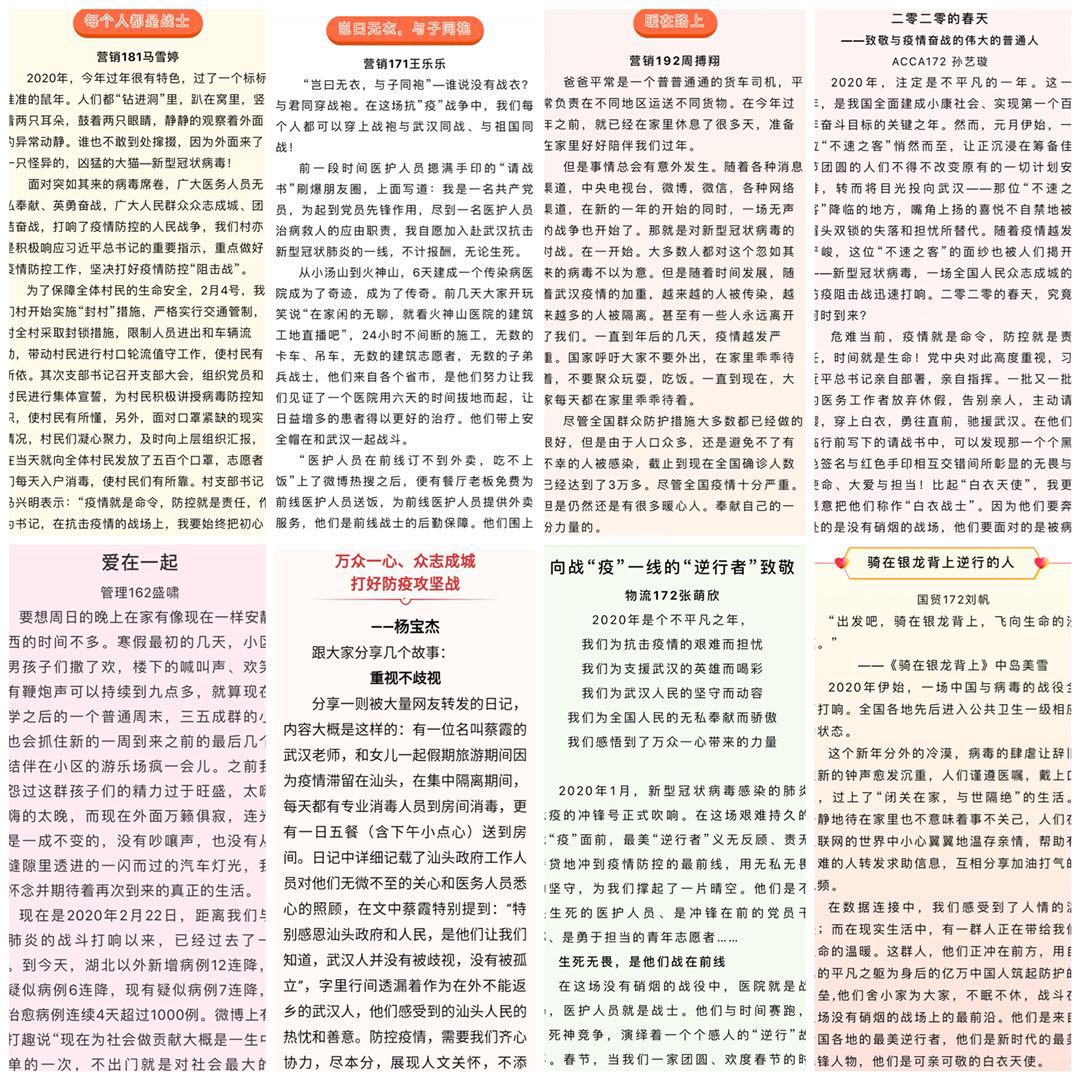 共收到涵盖书法、绘画、视频、海报设计、手抄报创作等艺术形式的艺术作品128件。其中,财务192班宋首霖的楷体书法,书写苍劲有力,内容激扬斗志,以方正之势彰显了“翰墨传祝福,同心战疫情”的决心;国贸192班张书榕在海报中绘出了共援武汉的希望之手,以海报的形式表达了中国人民万众一心、共克疫情的坚定信念;国贸171班王熙媛将医护人员和新型冠状病毒绘以卡通人物形象,以手抄报的形式在普及防疫知识的同时,表达了中国人民战胜疫情的决心。