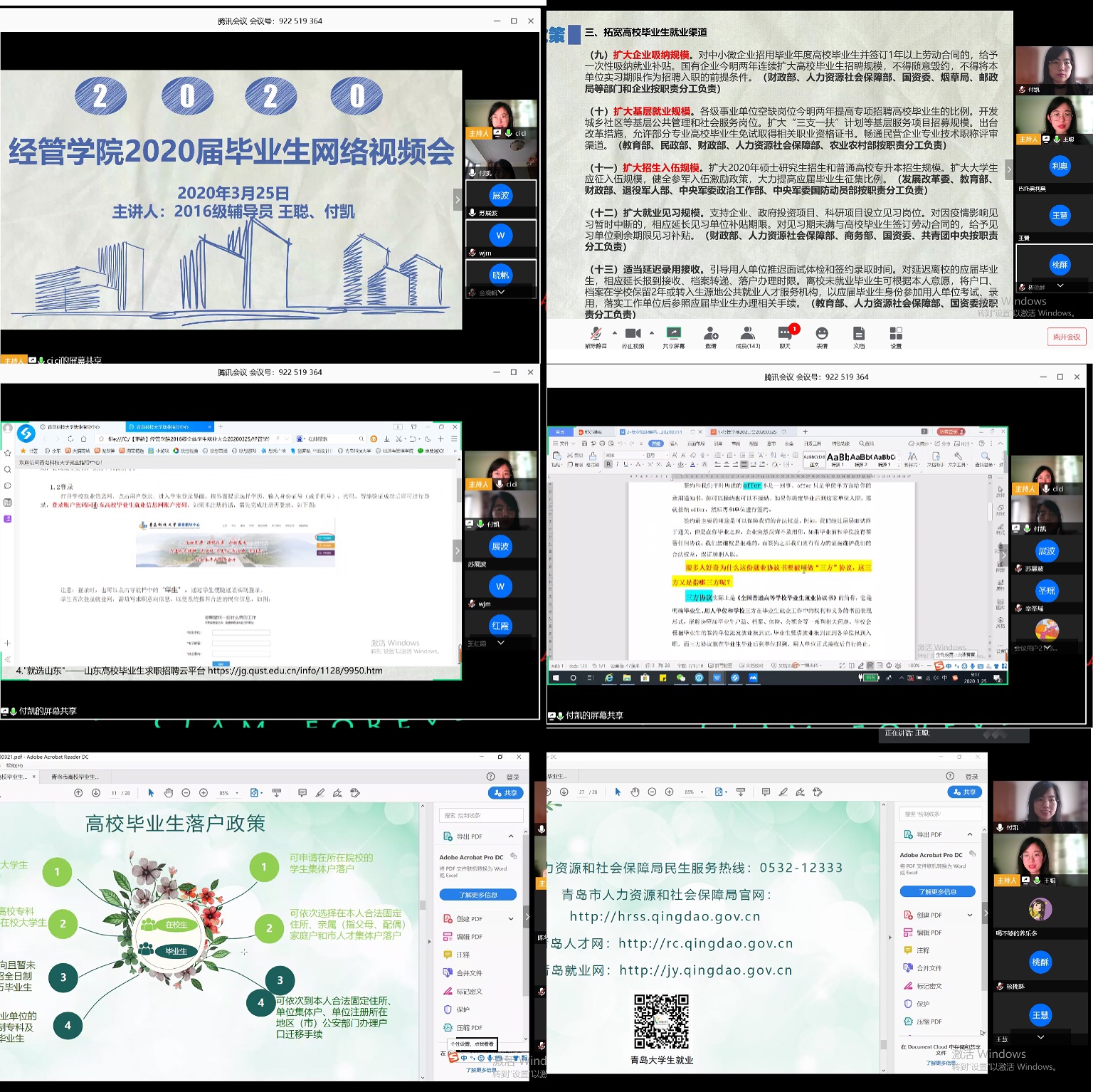 疫情期间对困难生、少数民族、湖北学生的就业帮扶举措,并针对考研复试和调剂准备,毕业论文撰写,答辩时间安排,成绩、学分确认,党团关系转接,毕业派遣,档案转出,报到证、毕业证及学位证领取等毕业相关事宜做出提醒和说明,同时,再次强调了疫情期间个人防护举措、禁止提前返校和安全信息的及时上报问题。此外,王聪就高校毕业生网络招聘平台、“青岛人社·学历汇”、高校毕业生落后及住房保障、高校毕业生就业、创业政策等五个方面进行就业政策解读,鼓励同学们充分知晓政策、用好政策、享受政策,高质量完成就业。