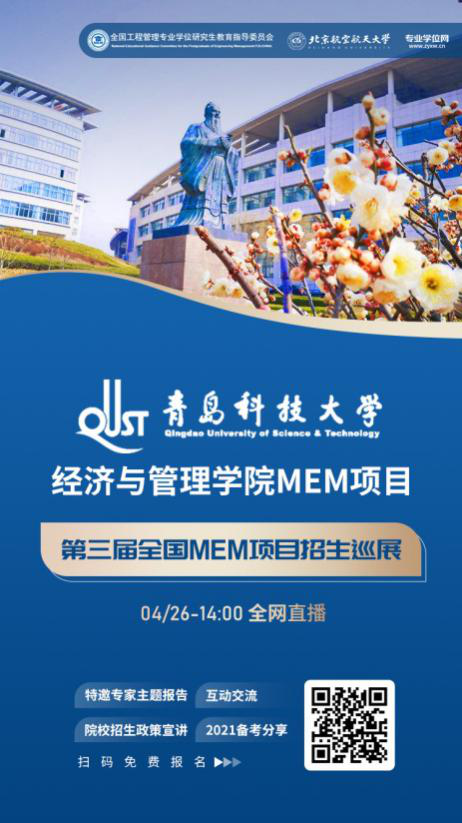 MEM项目将应邀参加由全国工程管理专业学位研究生教育指导委员会作为指导单位、专业学位网协办的“第三届全国MEM招生巡展”,时间为4月26日14:00。