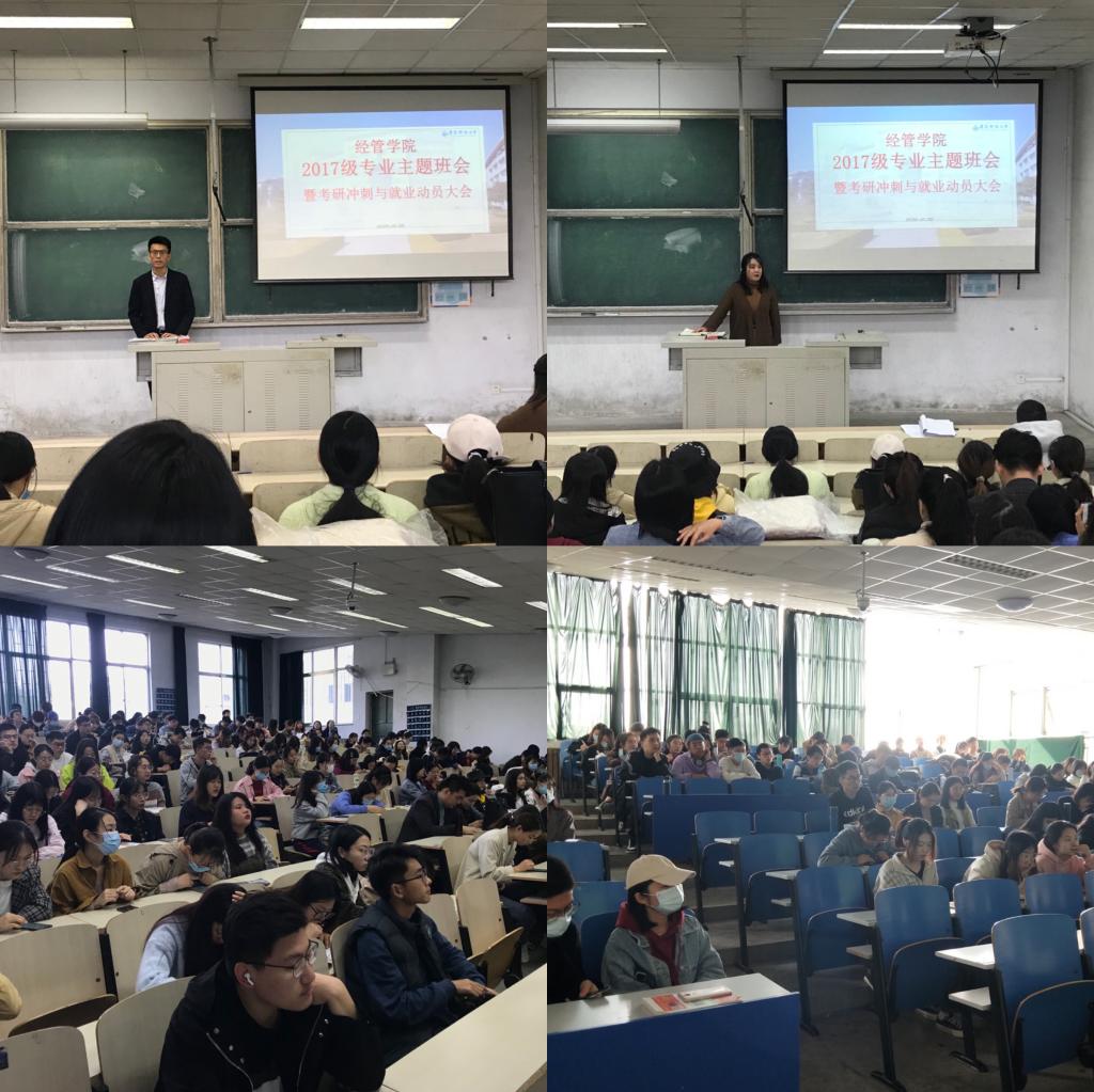 于弘毅楼E303、104室分专业召开2017级考研冲刺与就业动员大会。会议由17级辅导员张显全老师、张鸣老师主持,17级全体学生参加。