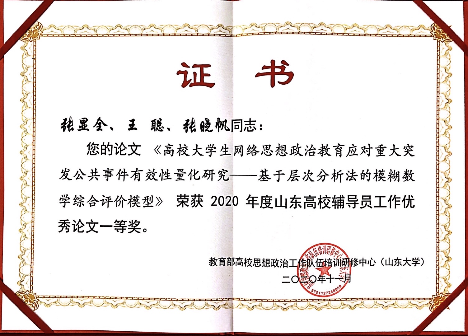 论坛对2020年山东高校辅导员工作论坛获奖论文进行了表彰。全省200余所高校(含高职)推荐的1000余篇论文共有97篇论文获奖(其中一等奖20篇,二等奖33篇,三等奖44篇)。学校共有3篇论文获奖(其中一等奖2篇、二等奖1篇),由我院刘跃宁、孙一君、王辰撰写的《风险管理视域下高校辅导员职业能力提升路径研究》,张显全、王聪、张晓帆撰写的《高校大学生网络思想政治教育应对重大突发公共事件有效性量化研究——基于层次分析法的模糊数学综合评价模型》两篇论文获得一等奖,获奖数量和质量均有重大突破。