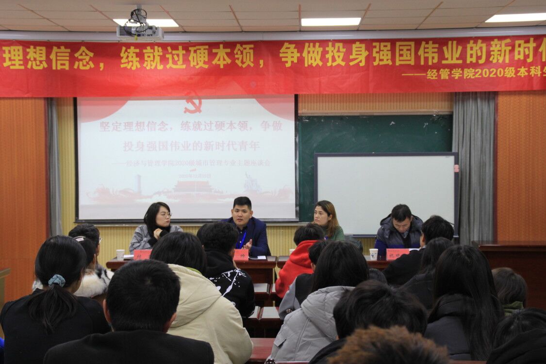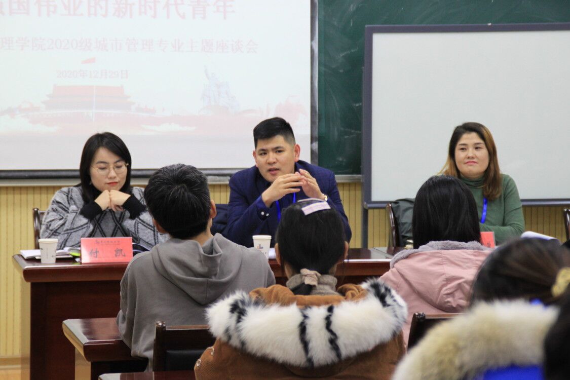 2020城市管理专业“坚定理想信念,练就过硬本领,争做投身强国伟业的新时代青年”主题座谈会于经管楼419会议室举行,党委(校长)办公室副主任王帅、学生工作处少数民族办公室辅导员热孜亚·茹孜、城市管理专业20级班主任祝晓波出席此次会议,座谈会由20级辅导员付凯主持,城市管理专业全体同学参加。