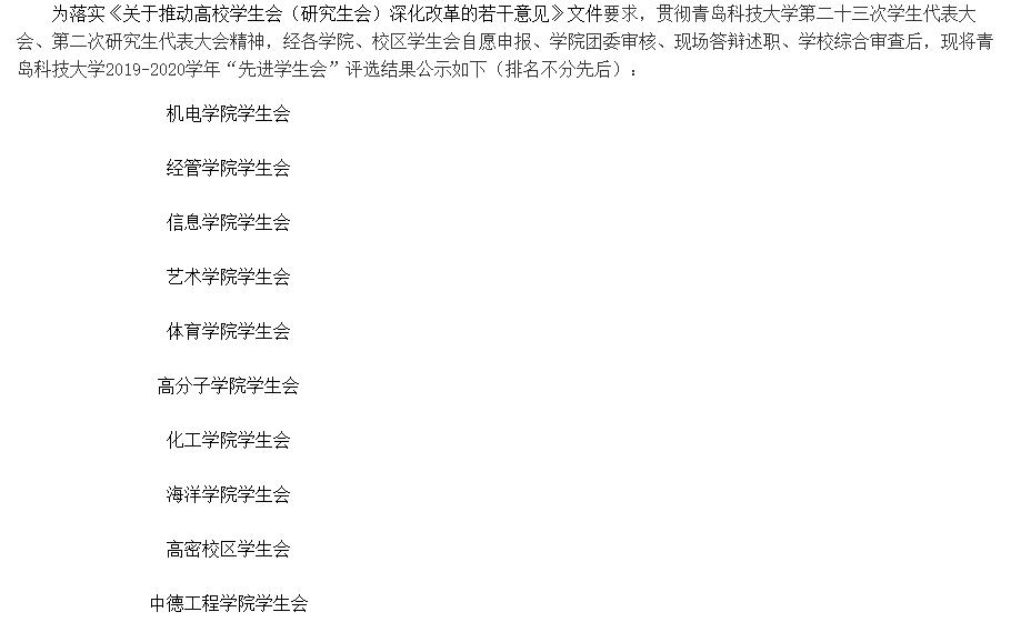 近日,在学校团委关于青岛科技大学2019-2020学年“先进学生会”荣誉的评选中,我院学生会再度荣获学校2019-2020学年“先进学生会”称号。