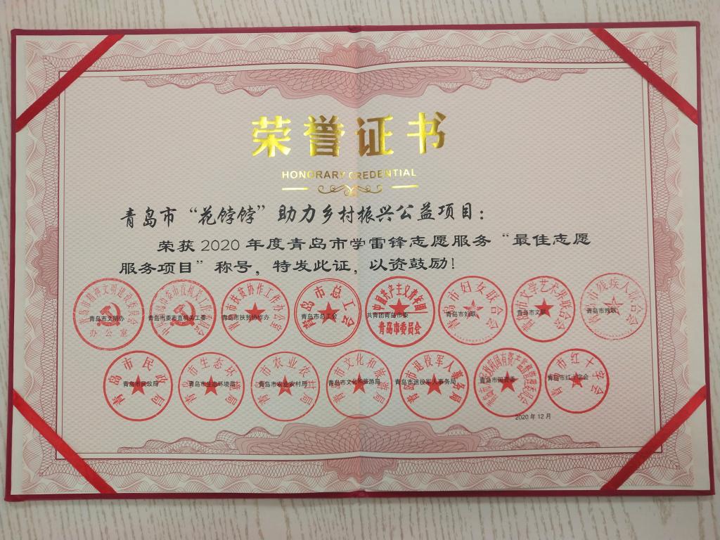 近日,青岛市文明办等部门和单位共同开展2020年度全市宣传推选学雷锋志愿服务“四个100”先进典型活动。在各区市、各单位层层推荐的基础上,经主办单位初评、专家复评、网上公示等程序,由我院学子长期运作的“花饽饽”助力乡村振兴公益项目获2020年度青岛市学雷锋志愿服务“四个100”先进典型——最佳志愿服务项目。