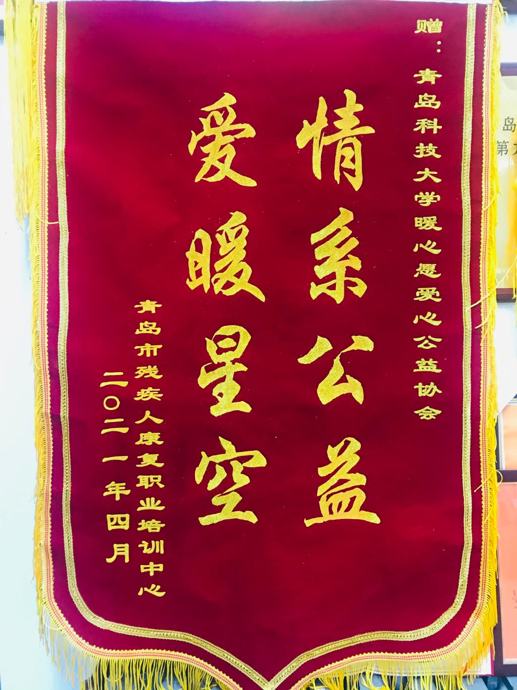 “暖心愿”爱心公益协会“情系公益 爱暖星空”荣誉锦旗,表彰团队长期以来的无私奉献以及对康复中心儿童的关心关怀。