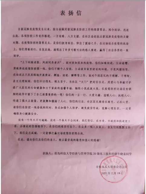牛晓童同学在疫情防控工作中勇敢逆行,奔赴疫情防控第一线,与志愿者们共同坚守岗位,努力勤恳完成本职工作,践行“奉献、友爱、互助、进步”的志愿精神。在岗期间充分发挥了身为一个共产党员的先进思想觉悟,受市级团委颁发荣誉证书并授予辛集市“最美青年志愿者”荣誉称号。
