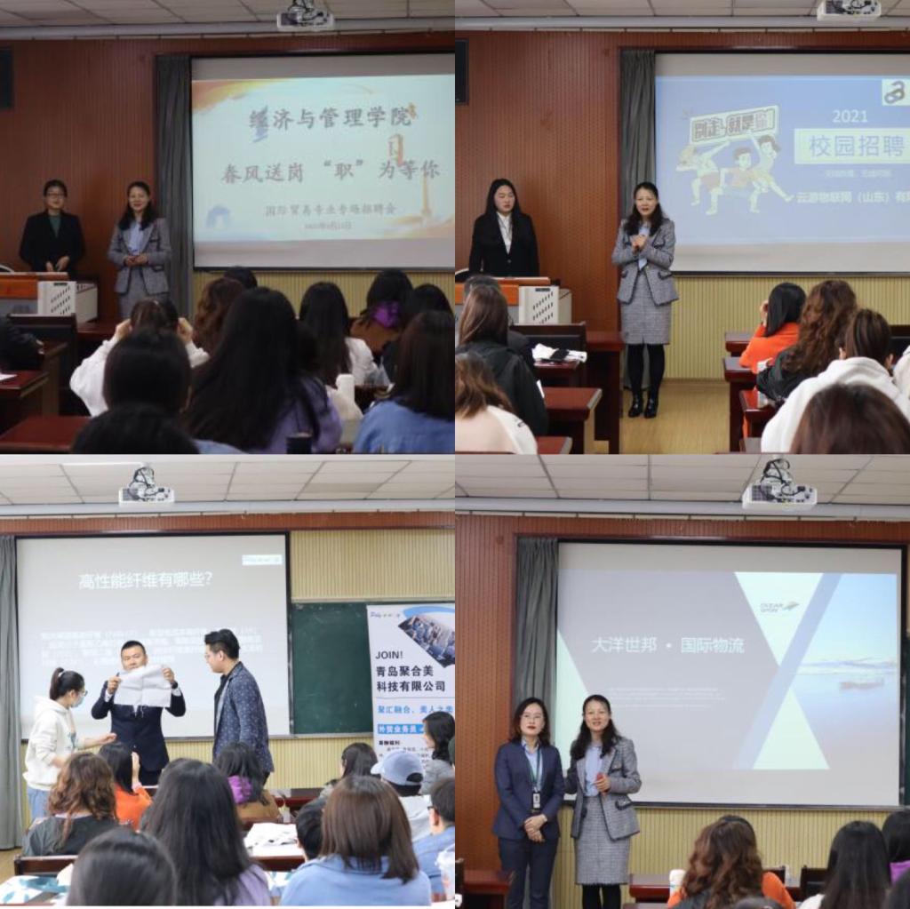 本次招聘会邀请到山东英科环保再生资源股份有限公司、云游物联网有限公司、青岛聚合美科技有限公司、青岛大洋世邦国际物流有限公司四家优质企业前来。各招聘企业负责人分别从企业规模、成就、发展前景、工作环境等方面介绍了企业的现状与优势,并详细地讲解了工作职位以及工资福利等相关内容。之后的问答环节,负责人耐心地对同学们的问题进行了解答。招聘会结束后,同学们积极投递简历并与心仪的用人单位进行深入沟通。