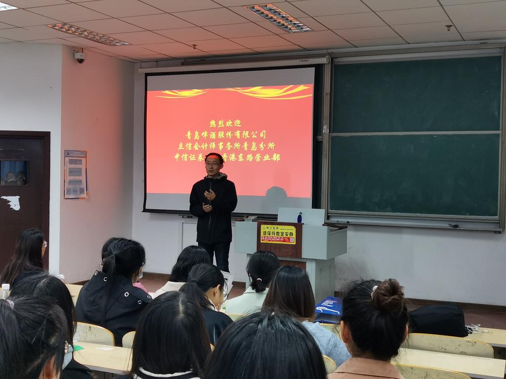 招聘会伊始,祝兵向全体毕业生做就业动员,并整体介绍了本场招聘会的基本流程。祝兵介绍了当前的就业形势,鼓励毕业生积极把握就业机会,充分发挥自身才干,积极转变就业观念。本次招聘会经过前期精密筹备,精心邀请青岛啤酒股份有限公司、立信会计师事务所青岛分所、海中信证券青岛香港东路营业部共三家优质企业到场宣讲。在企业宣讲环节,各企业招聘官不仅对公司背景、岗位工作内容、薪资待遇、面试流程、职位要求能力等方面进行了详细的介绍,并且安排了“直系学姐答疑解惑”环节现场解答同学们的疑问。随后,毕业生们现场投递简历,现场秩序井然,氛围热烈,各企业招聘官更是向毕业生们发出参观企业并且进行面试的邀请。
