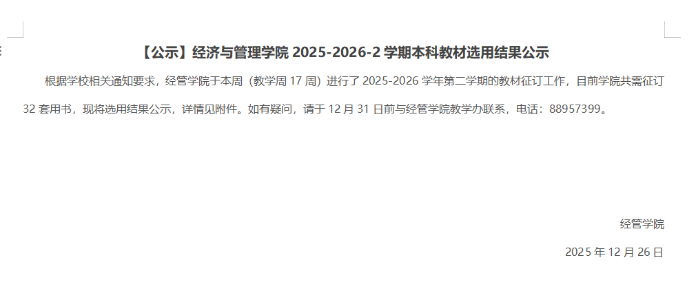 【公示】无码欧美 2025-2026-2学期本科教材选用结果公示